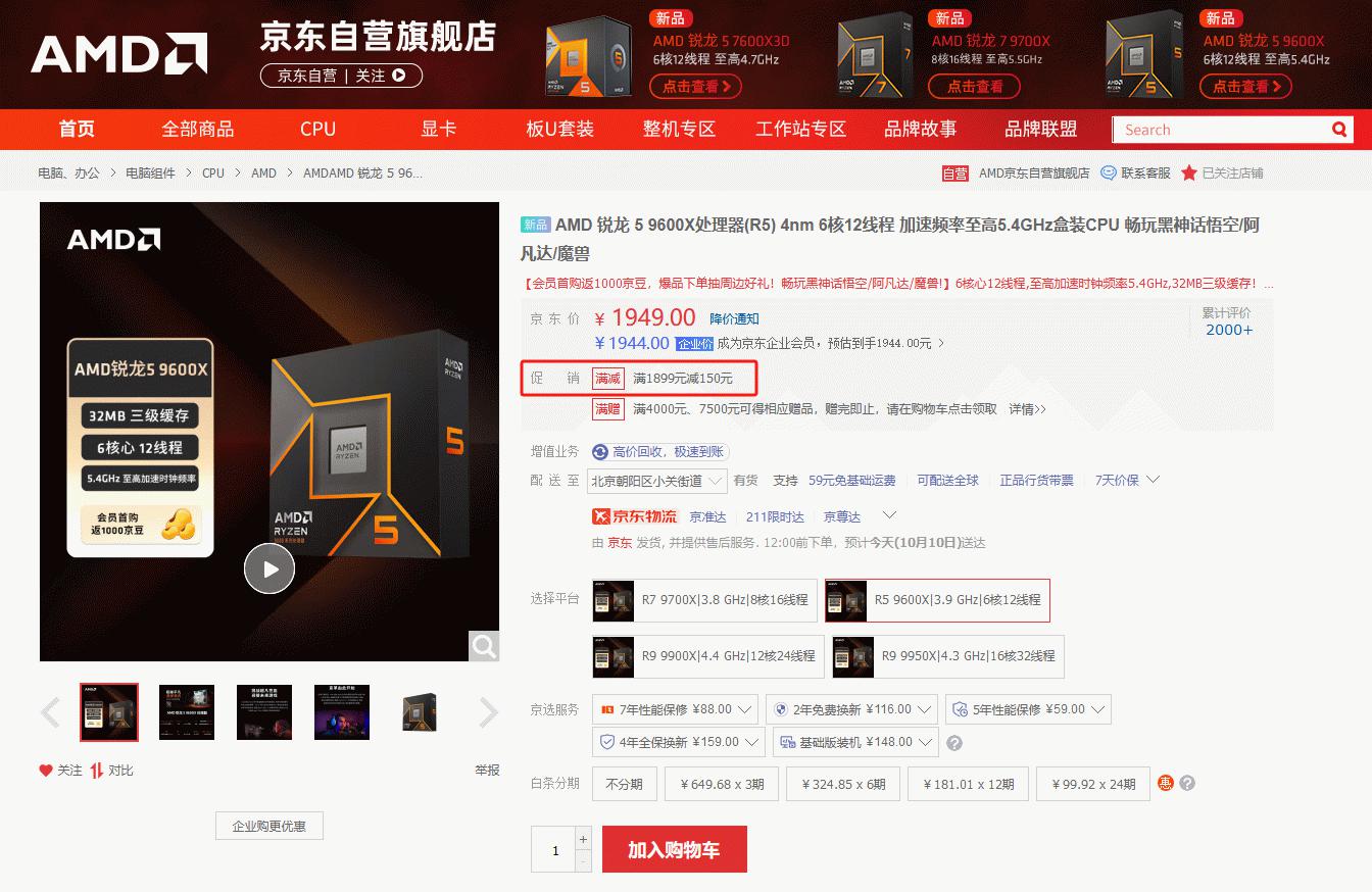 目前AMD 锐龙5 9600X处理器在京东自营旗舰店的报价是1949元,限时满减活动可以直降150元,到手只要1799元,同时可参与白条6期免息的优惠,月均只要300元,成为京东旗舰店会员还有首购返京豆和多重会员福利可享。对于节后攒机的DIY玩家来说,锐龙5 9600X处理器就是性价比首选。