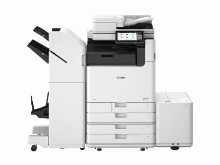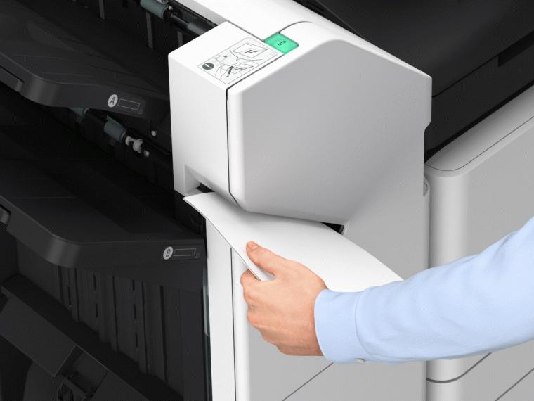 此外,佳能imageFORCE赢系列数码复合机还能够为复杂多变的办公场景提供坚实可靠的支撑。下纸盒支持52-300gsm纸张输出,同时能够轻松应对最大尺寸达420×1300mm的长纸打印需求。在装订工艺方面,设备可选配内置装订处理器,即便在高达70ppm输出状态下,可实现单页或分套输出出纸的对齐,方便用户拿取分发。选配分页装订处理器,可实现骑马钉、C型折页,以及角钉、双钉、无钉装订等各类装订任务,为专业文印带来更多可能。